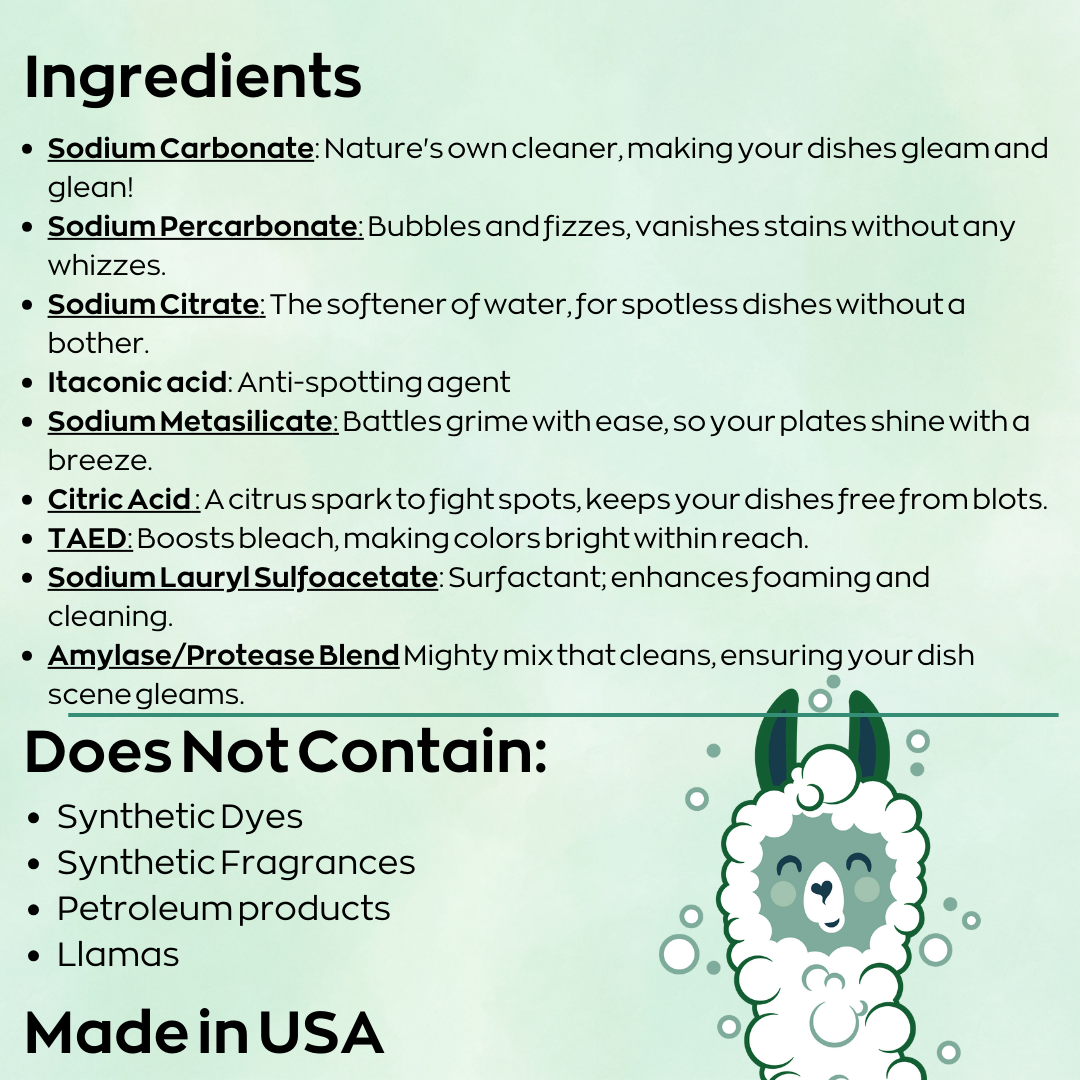 Green Llama Dishwasher Tablets in compostable packaging are perfect for those who value both the environment and superior cleaning. These eco-friendly, non-toxic tablets ensure dishes are sparkling clean and residue-free, without harsh chemicals. These are the perfect replacement for pods and are free from PVA and plastic.